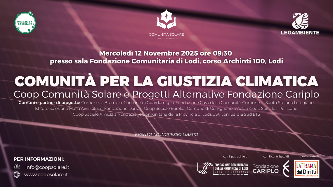Comunità per la giustizia climatica. Conferenza pubblica il 12 novembre 2025 ore 09:30-12:30, presso sala Fondazione Comunitaria di Lodi, corso Archinti 100, Lodi