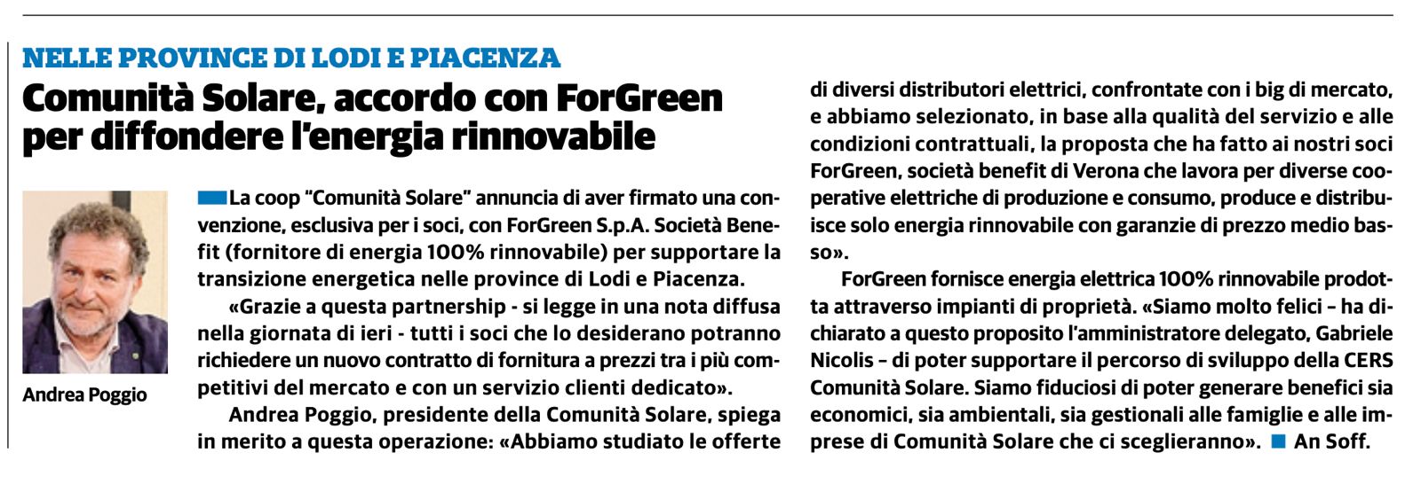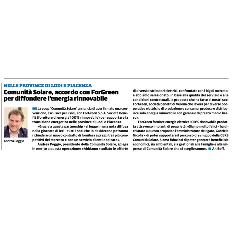 La Comunità Energetica Rinnovabile Solidale "Comunità Solare" e il fornitore di energia rinnovabile ForGreen si sono uniti per supportare la transizione energetica nelle province di Lodi e Piacenza.